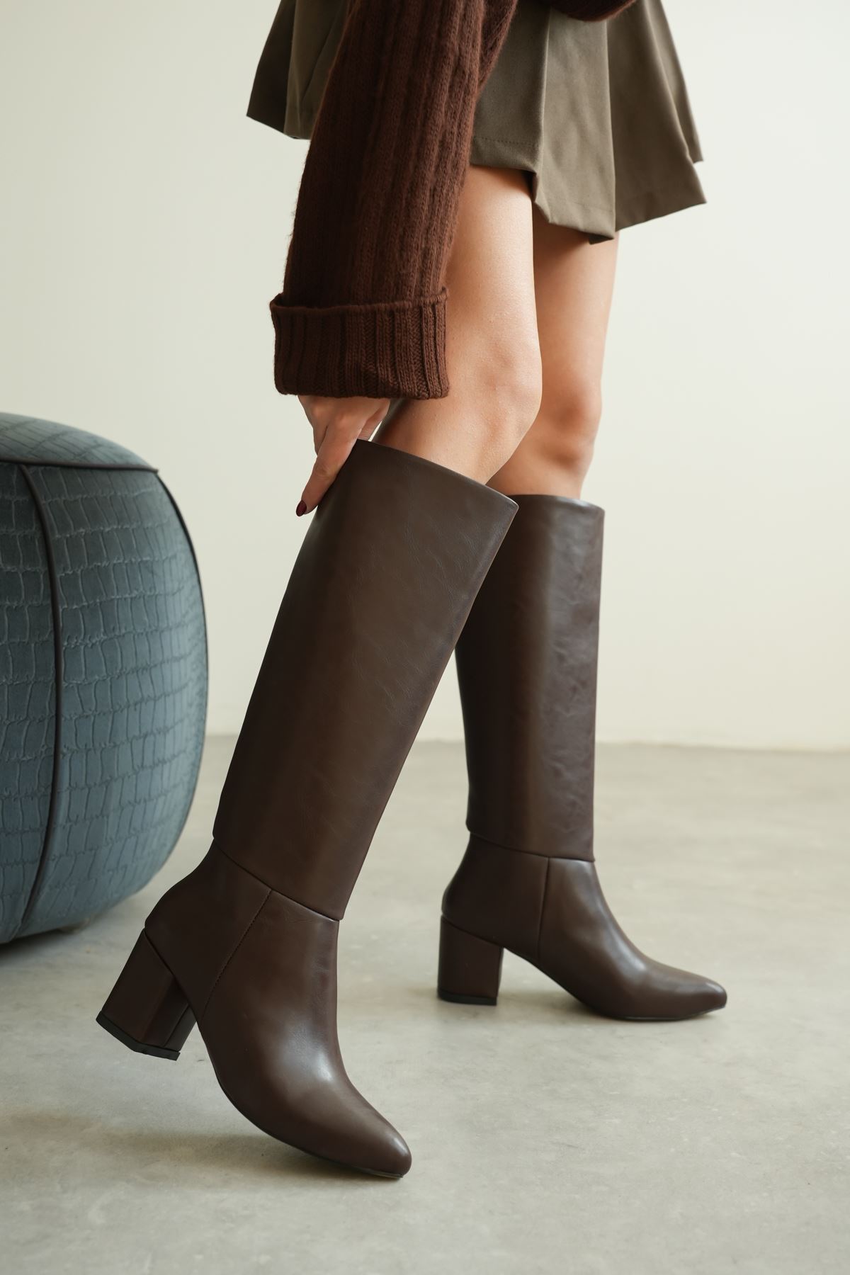 Kadın Akel Diz Altı Çekme Çizme - Kahve-Deri