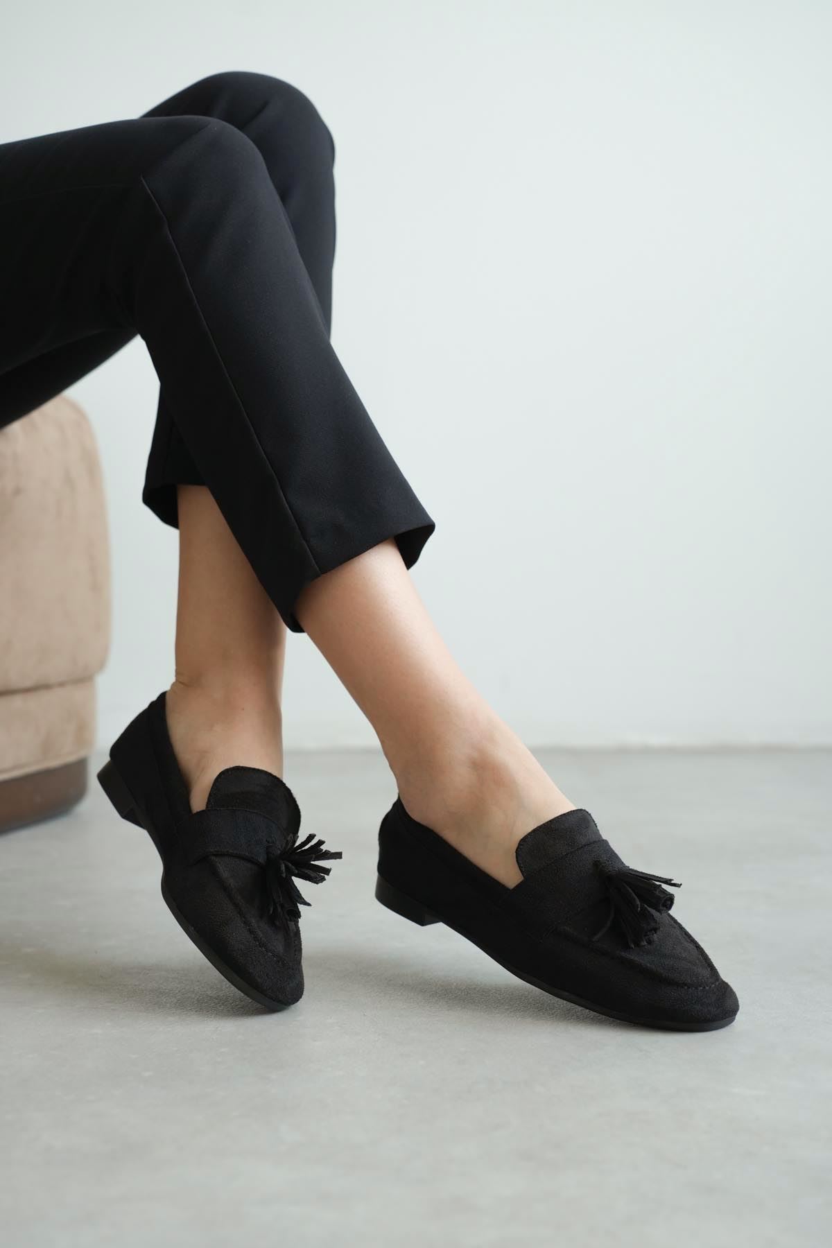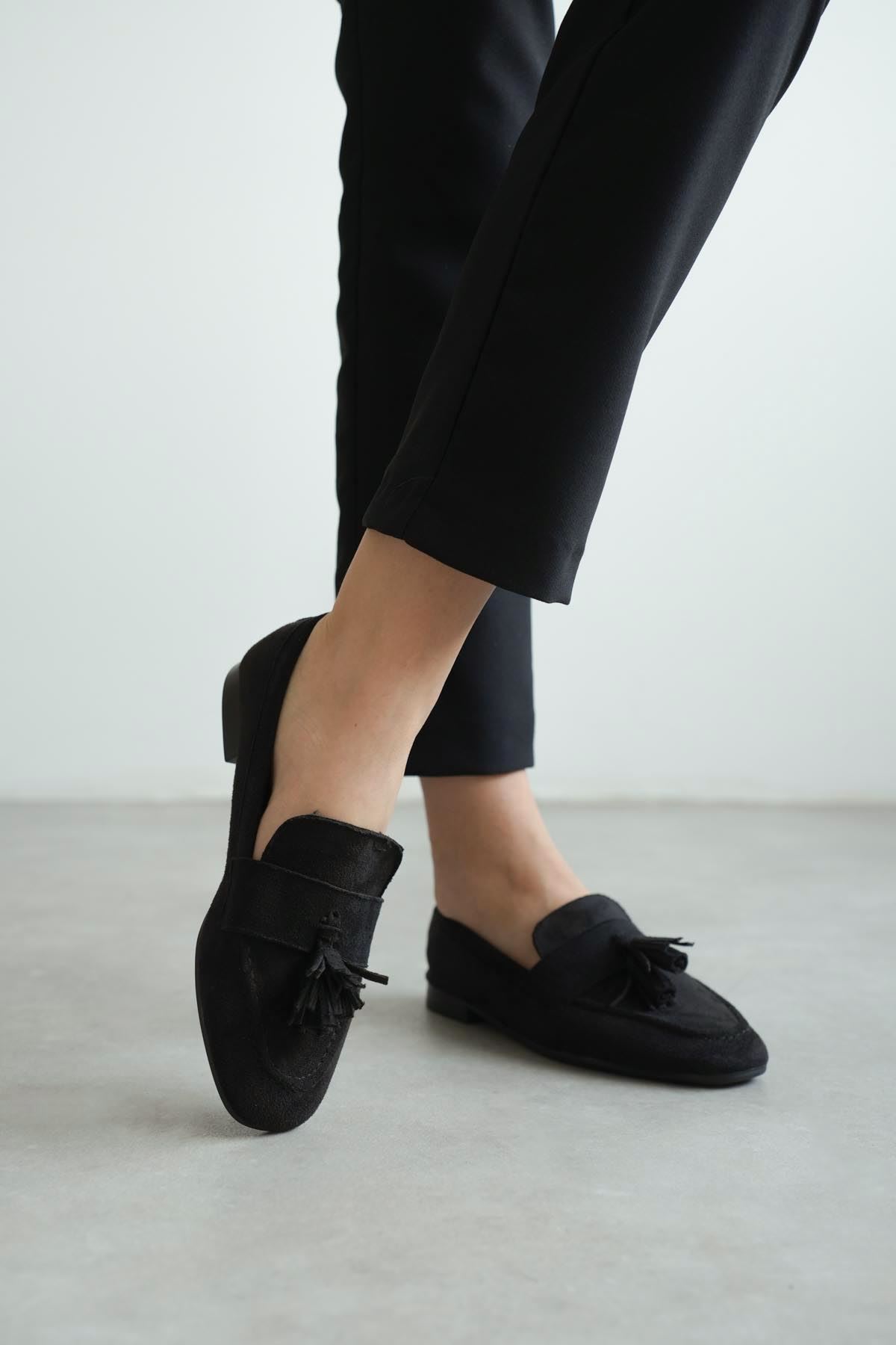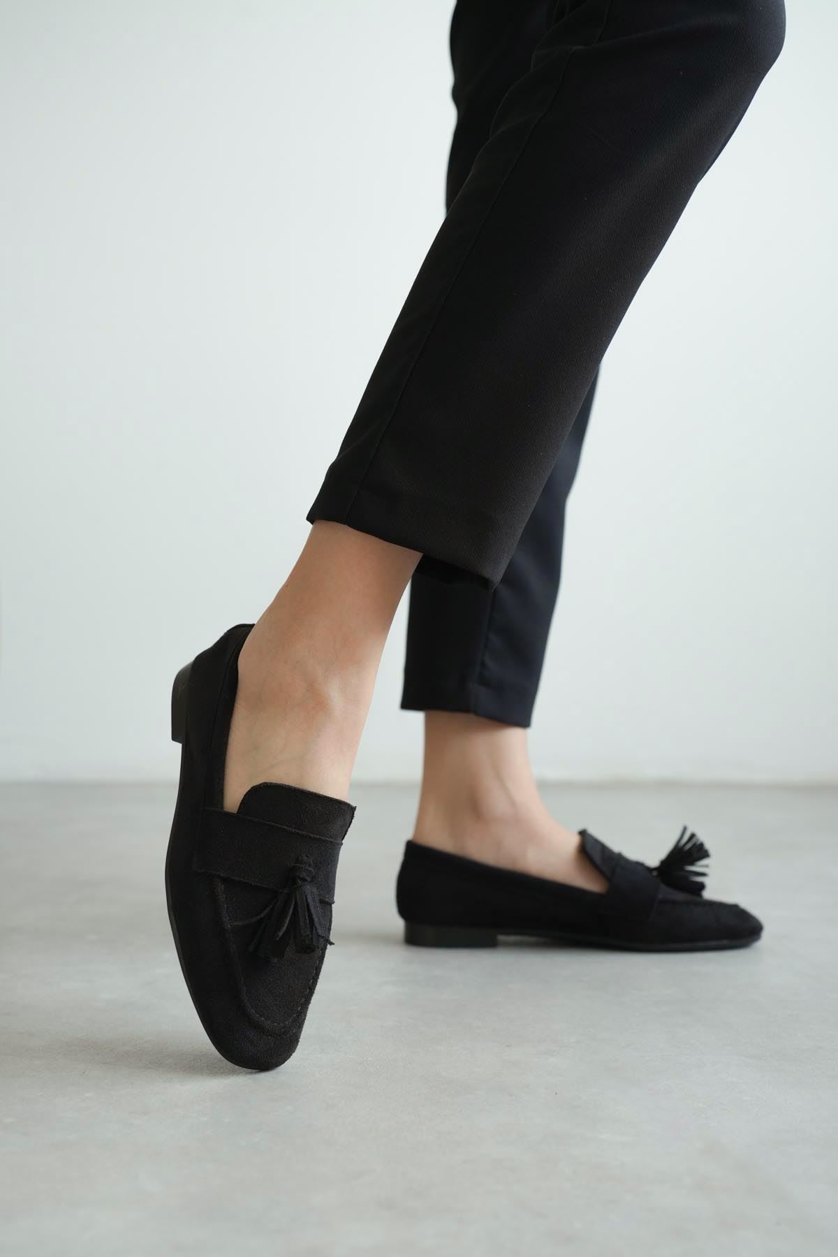 Kadın Boos Düz Taban Püsküllü Babet - Siyah Süet