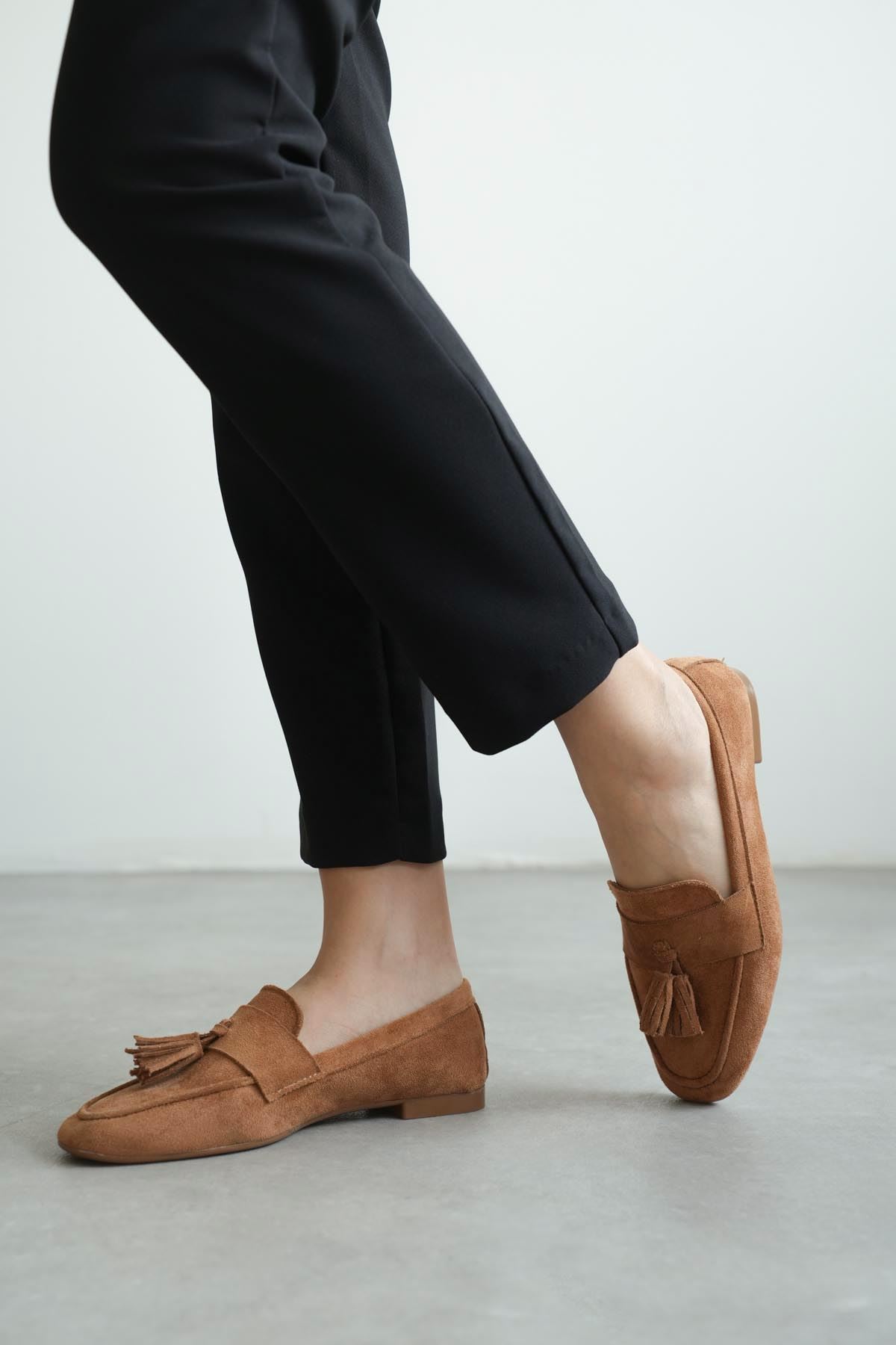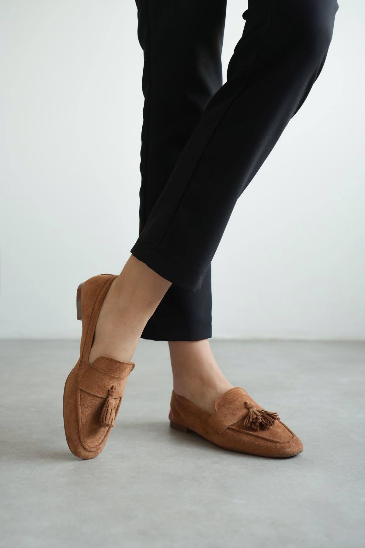 Kadın Boos Düz Taban Püsküllü Babet - Taba Süet