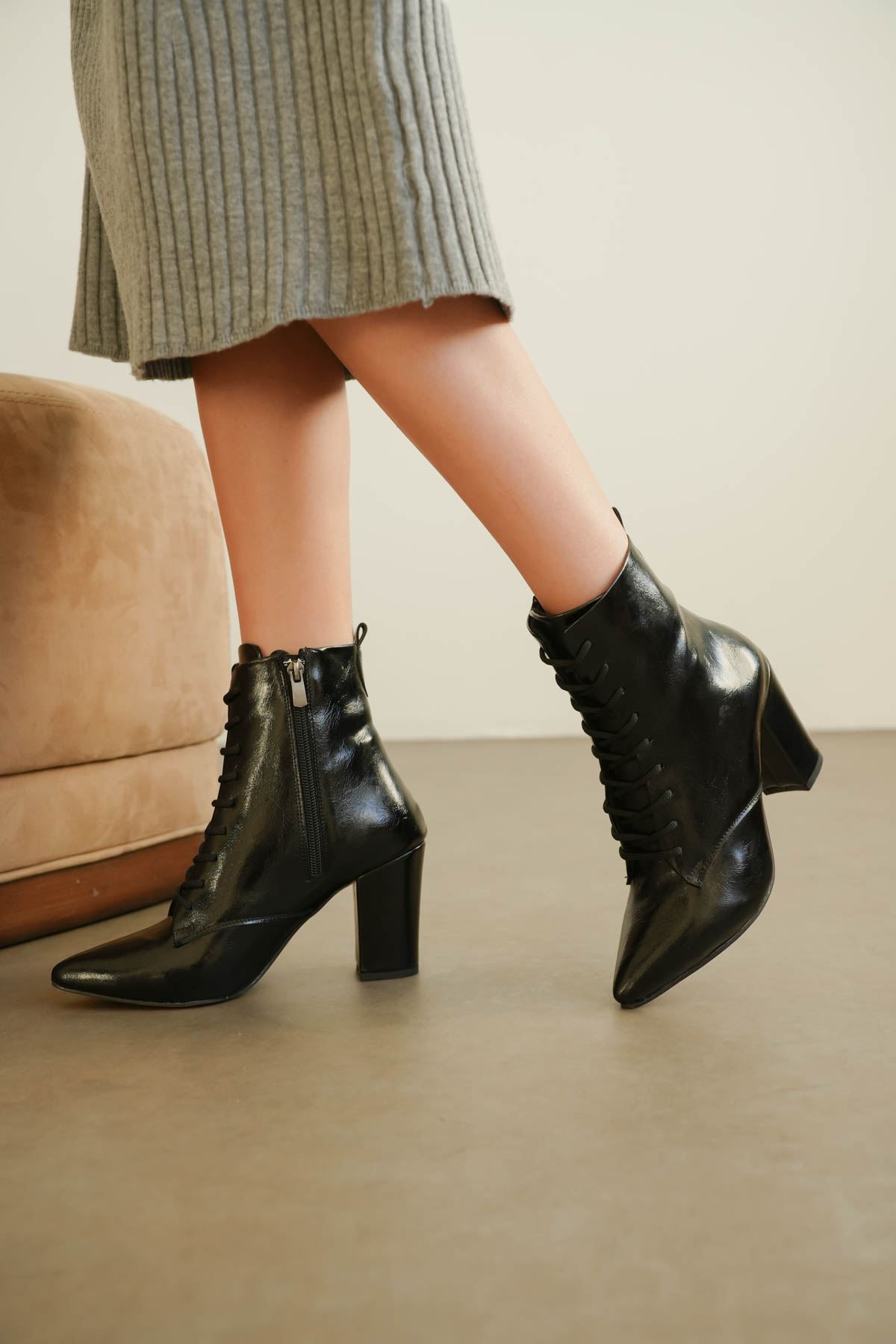 Kadın Candy Bağcıklı Sivri Burun Siyah Rugan Bot - Siyah