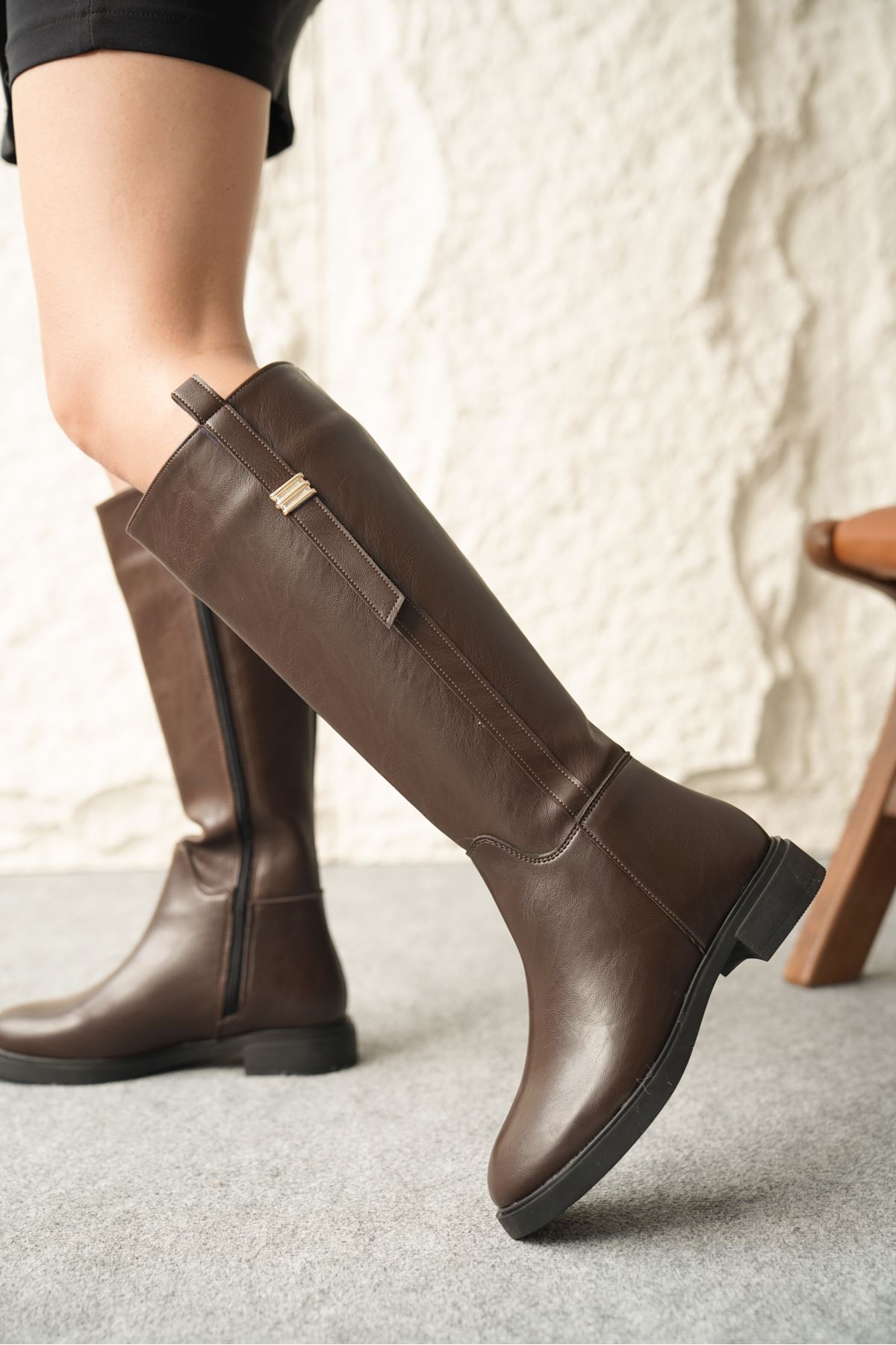 Kadın Gail Düz Tabanlı Tokalı Çizme - Kahve-Deri