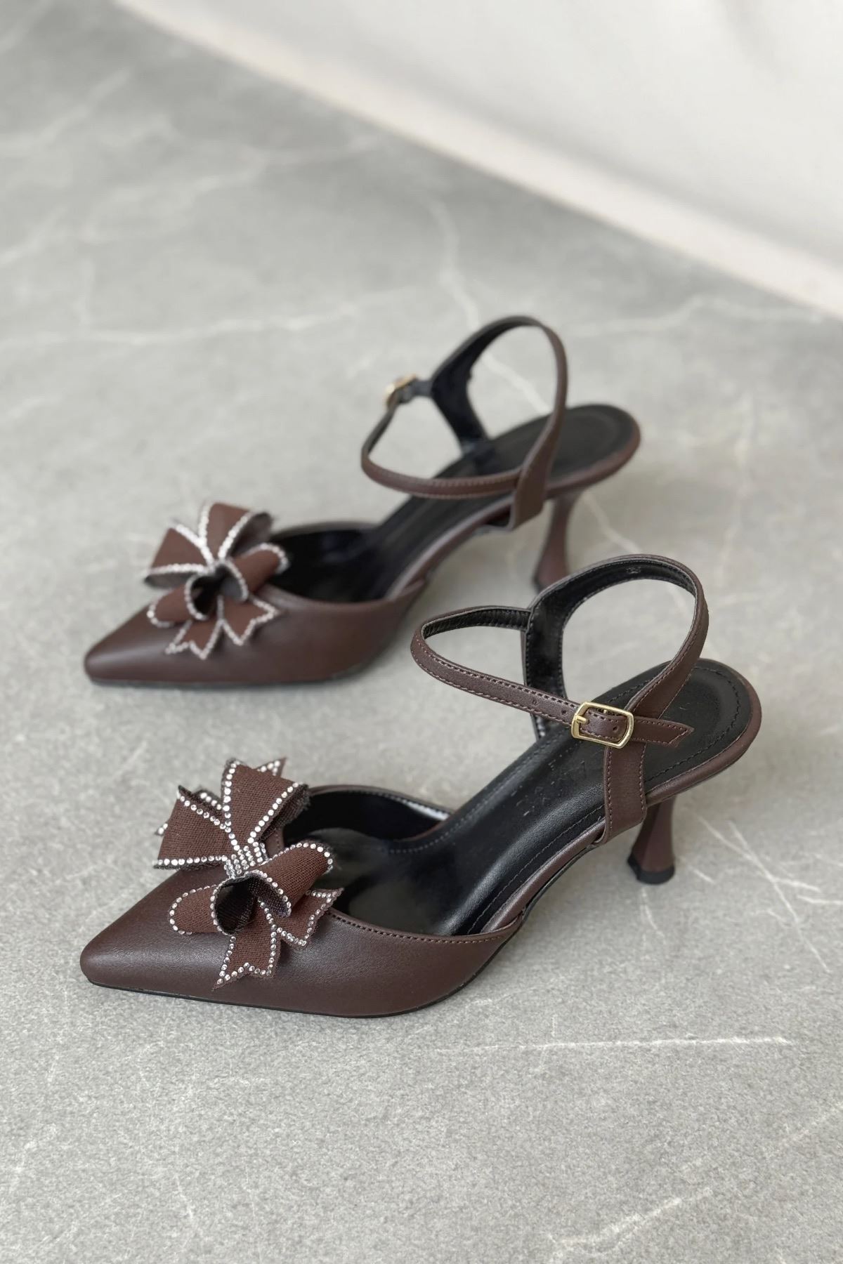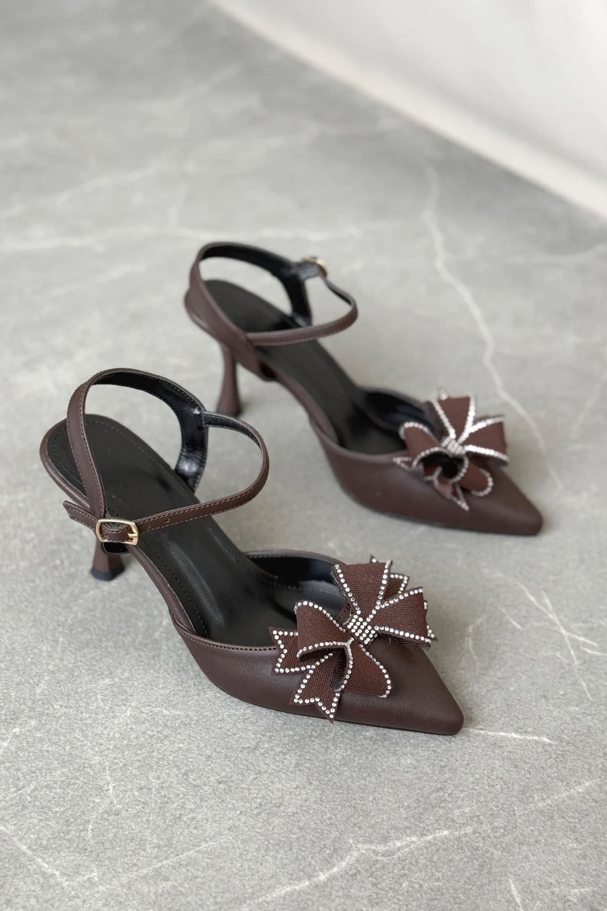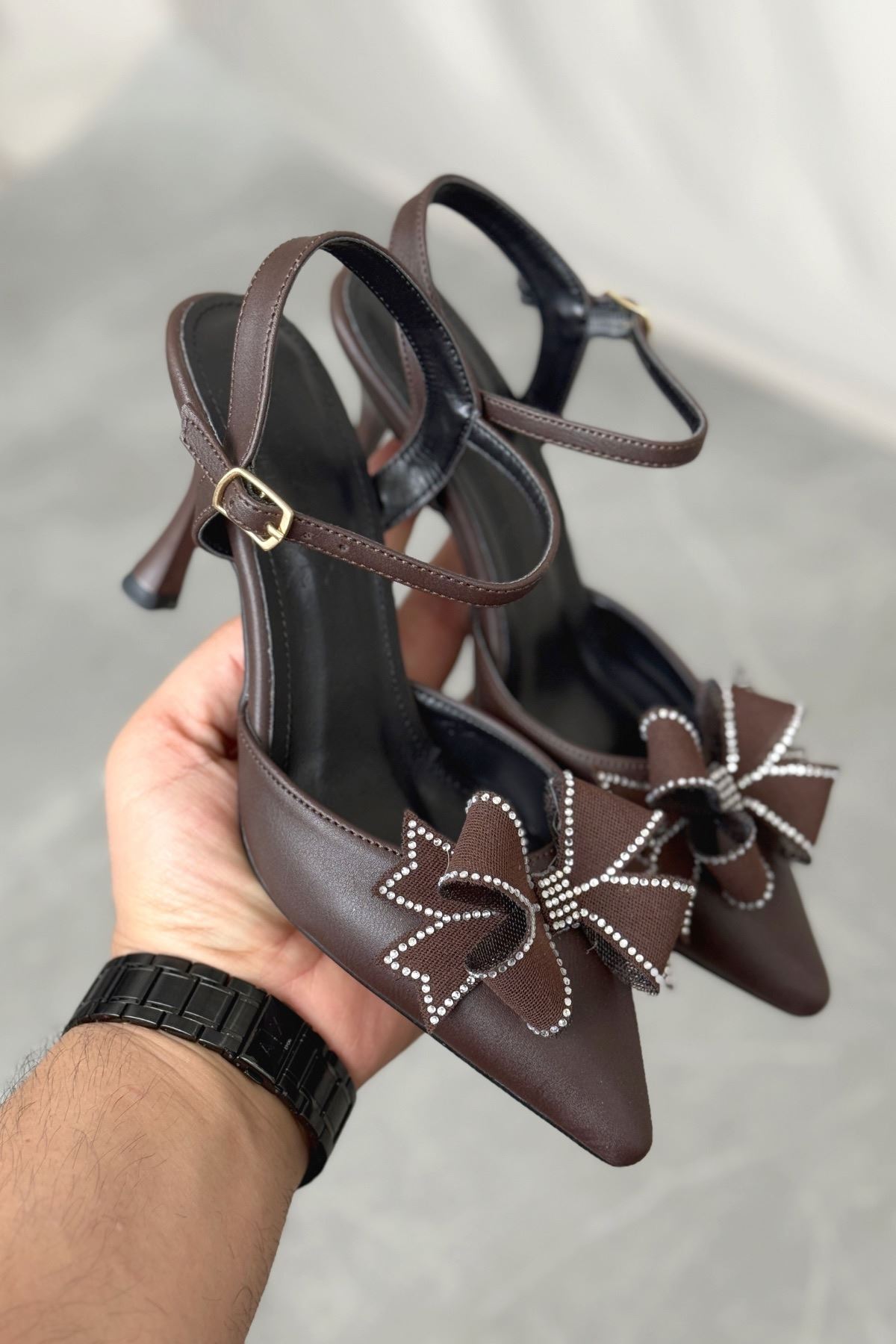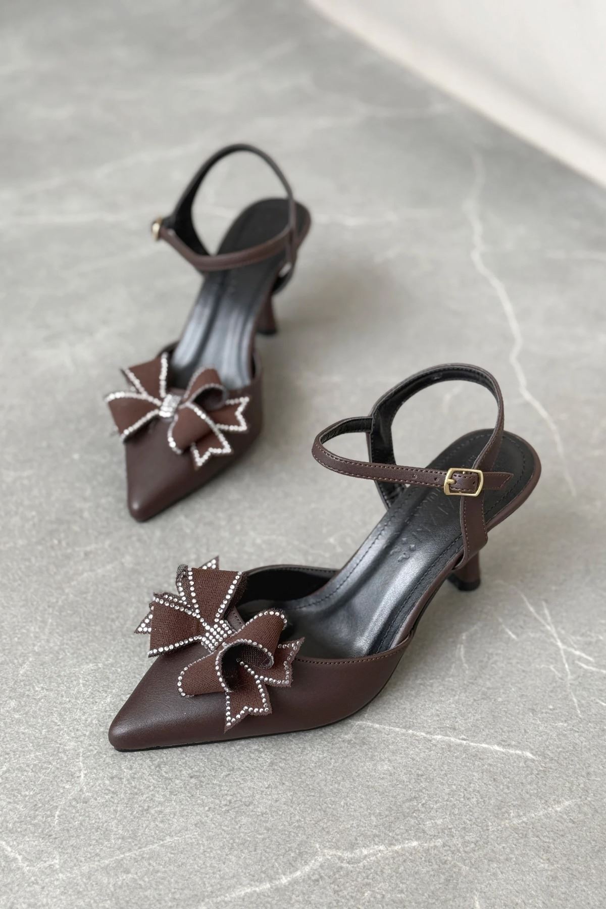 Kadın Godes Papyonlu İnce Topuklu Ayakkabı - Kahve-Deri