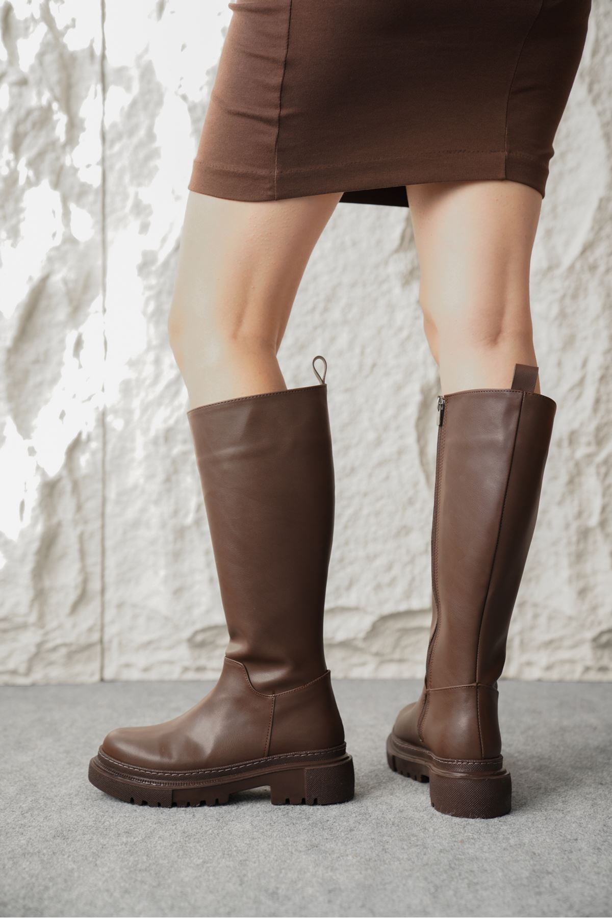 Kadın Kimber Kalın Taban Diz Altı Deri Çizme - Kahve-Deri