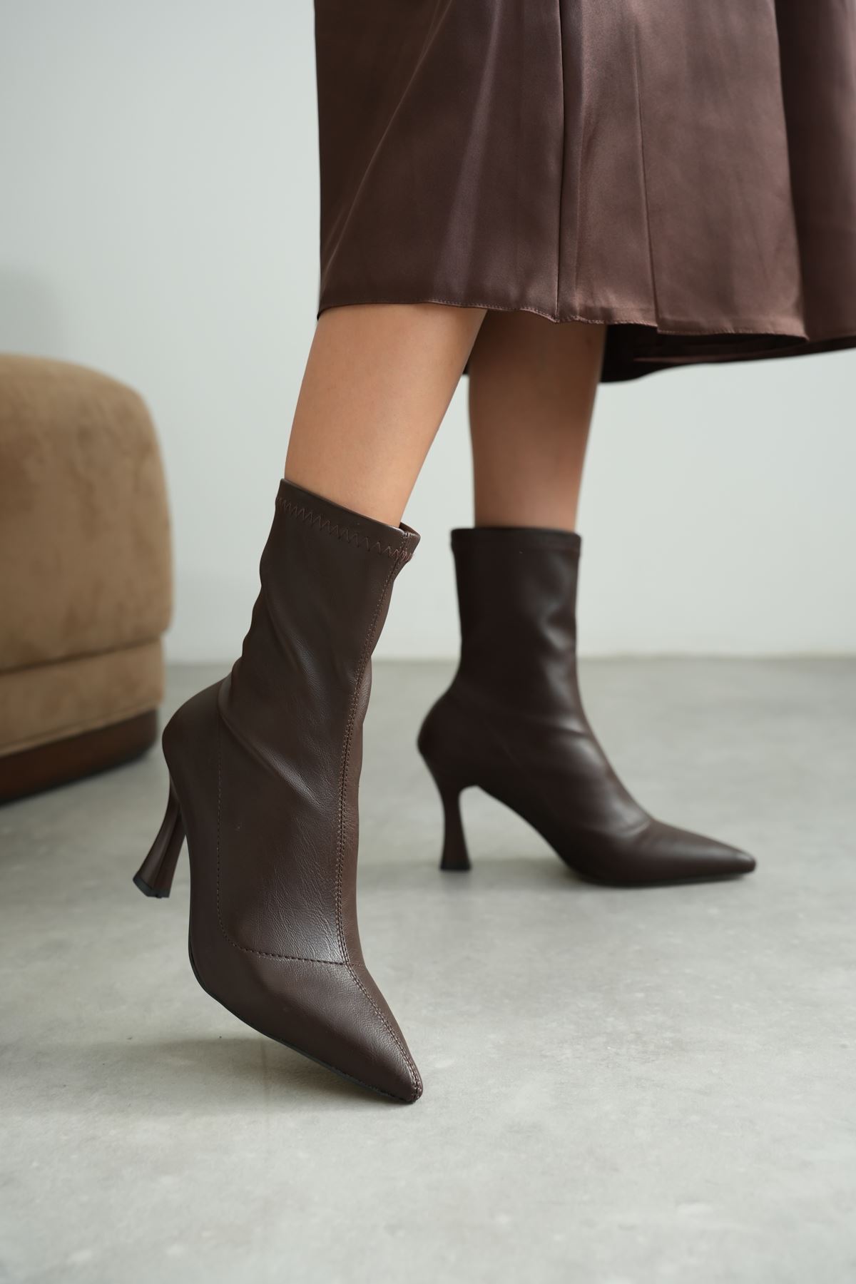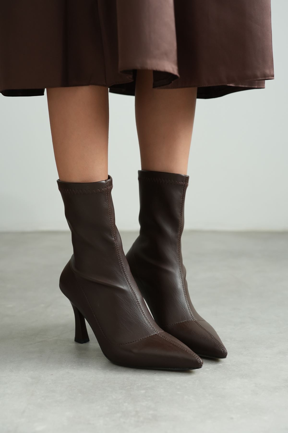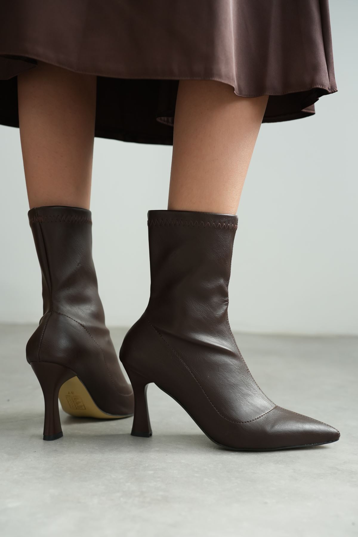 Kadın Lopez Streç Malzeme Sivri Burun Topuklu Bot - Kahve-Deri