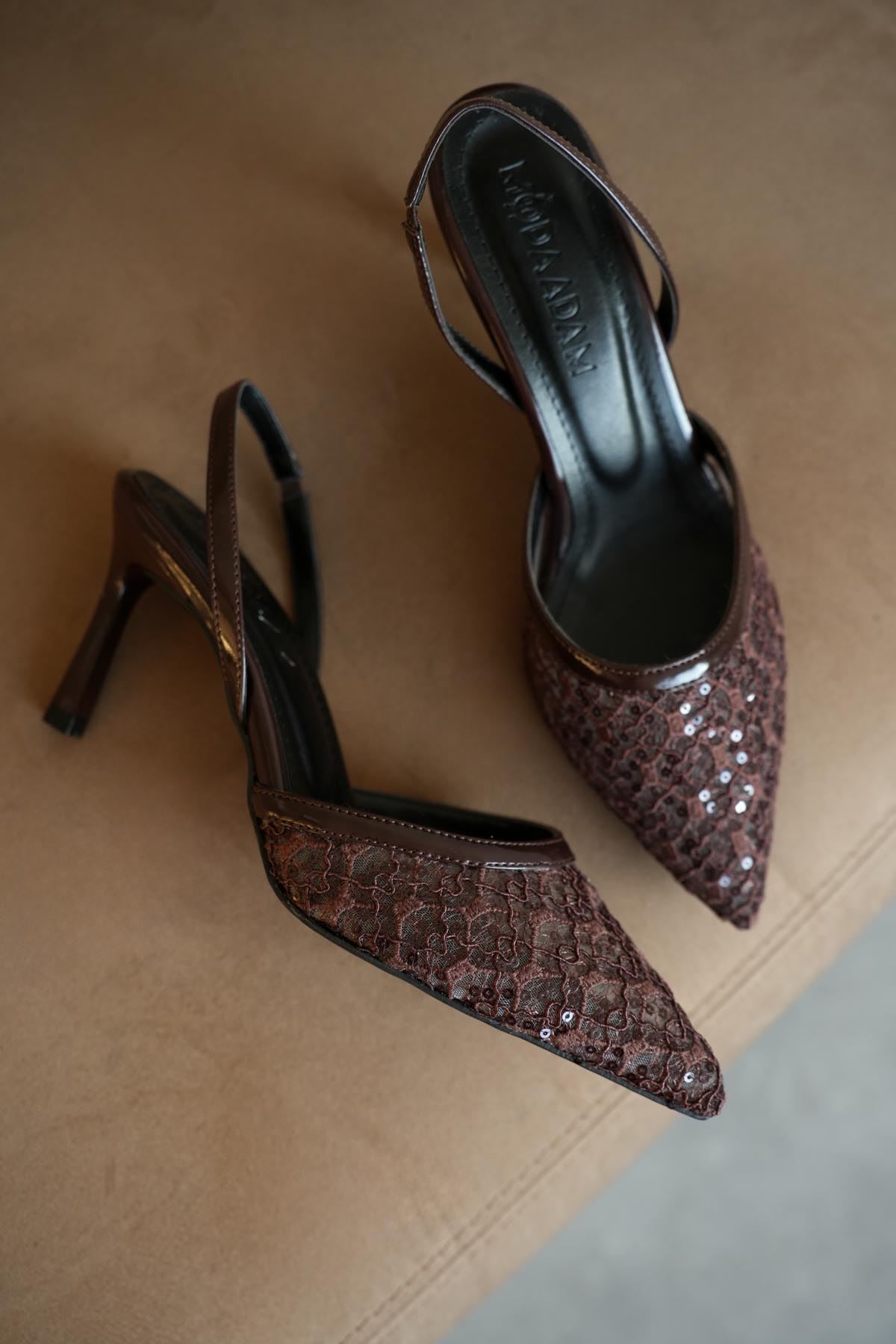 Kadın Lucco Pullu Dantelli Topuklu Ayakkabı - Kahve