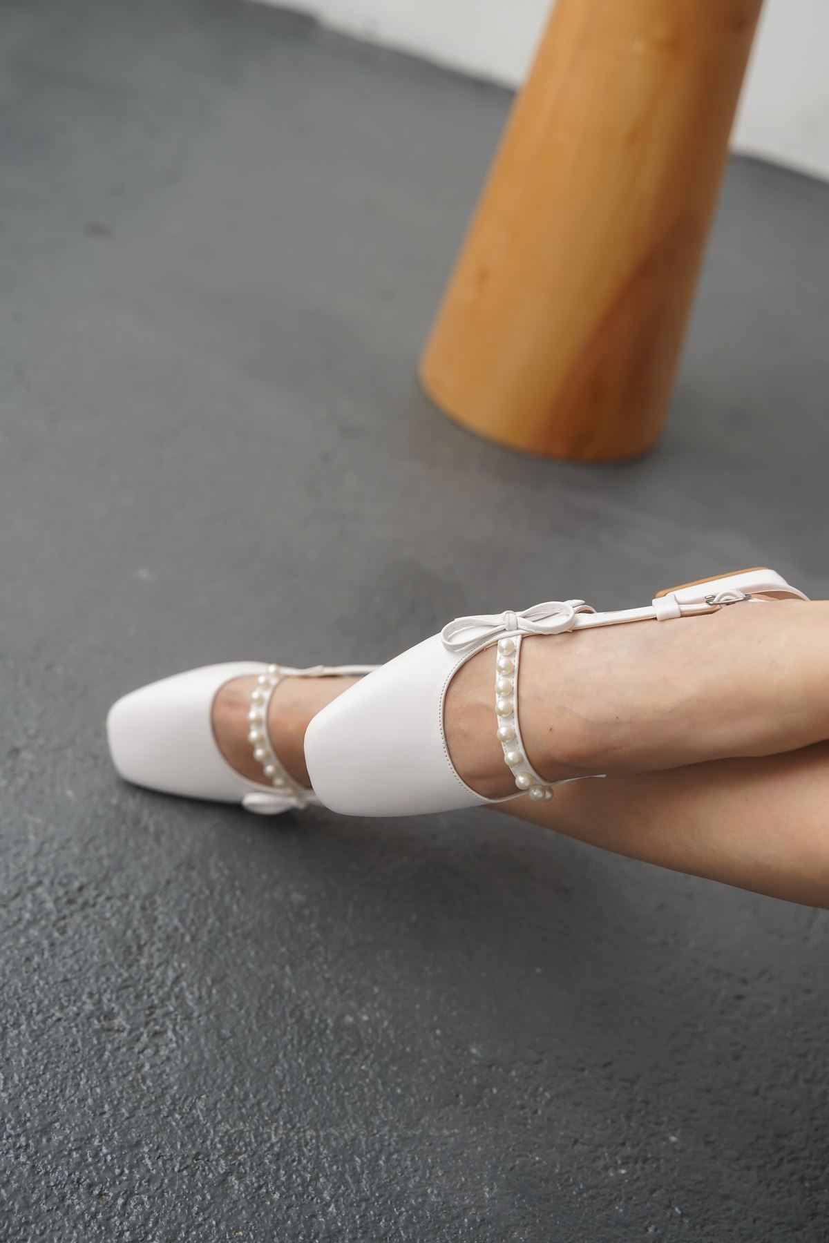 Kadın Maste İncili Kısa Topuklu Ayakkabı - Beyaz-Deri