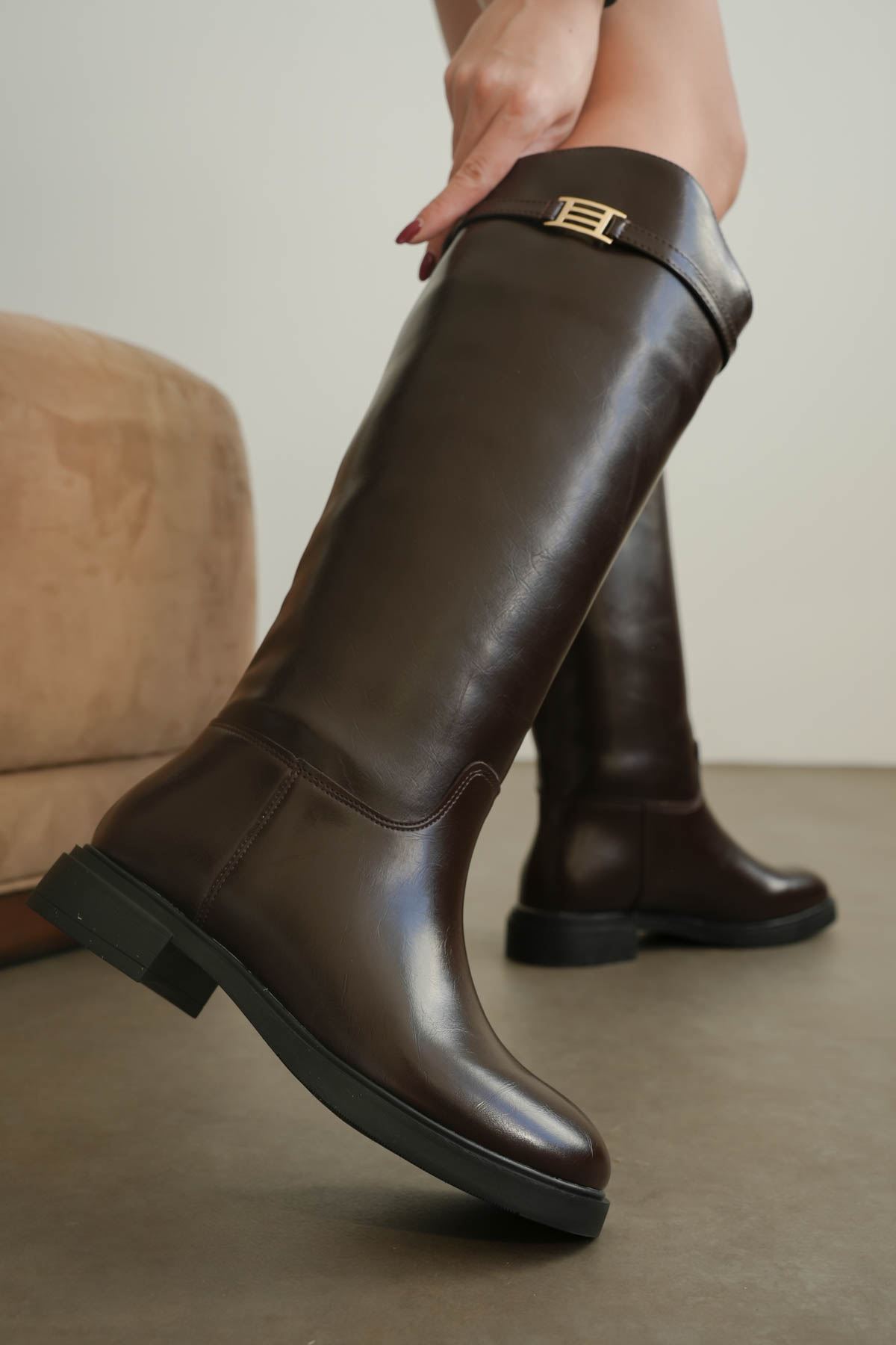 Kadın Nantes Düz Tabanlı Tokalı Çizme - Kahve-Rugan