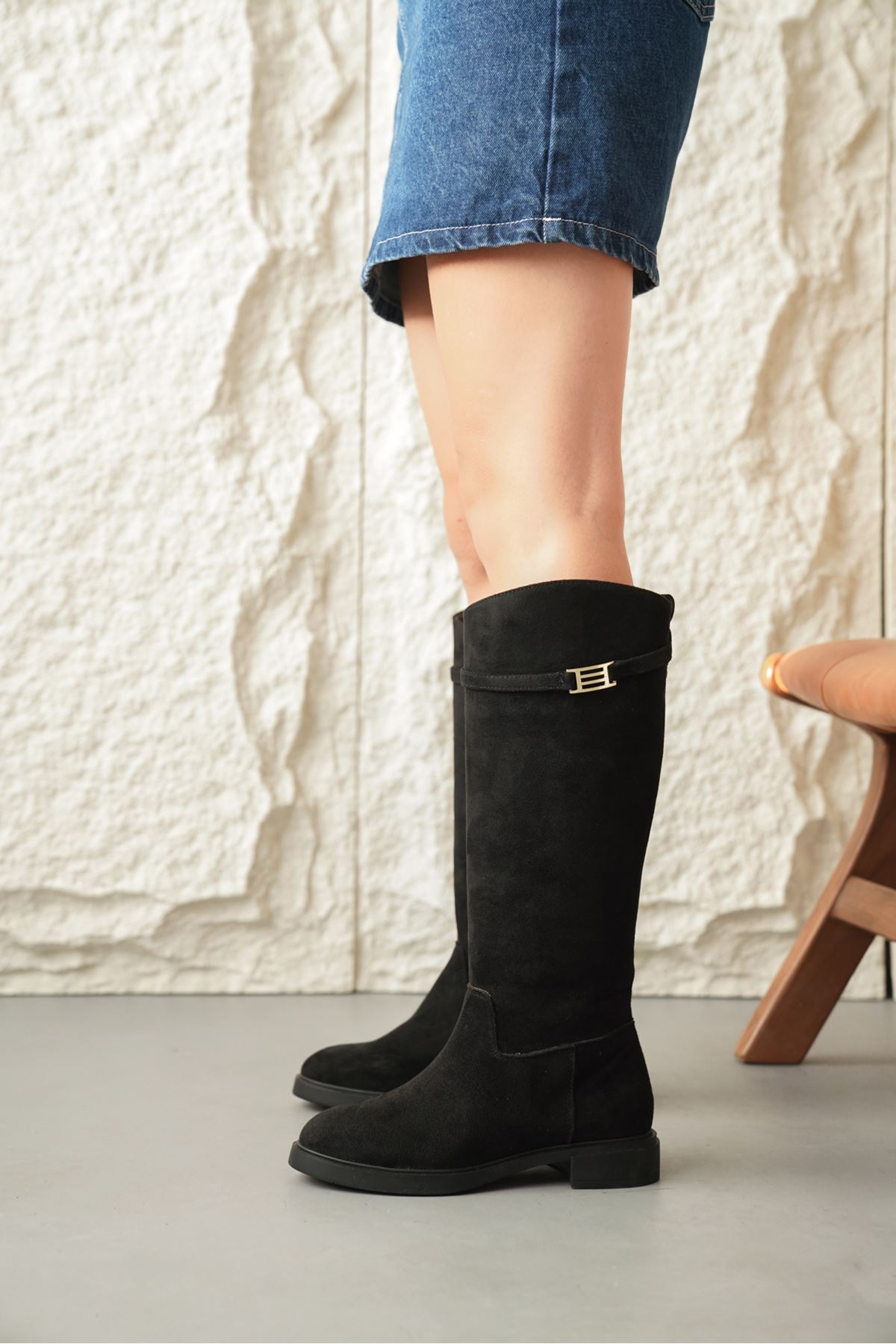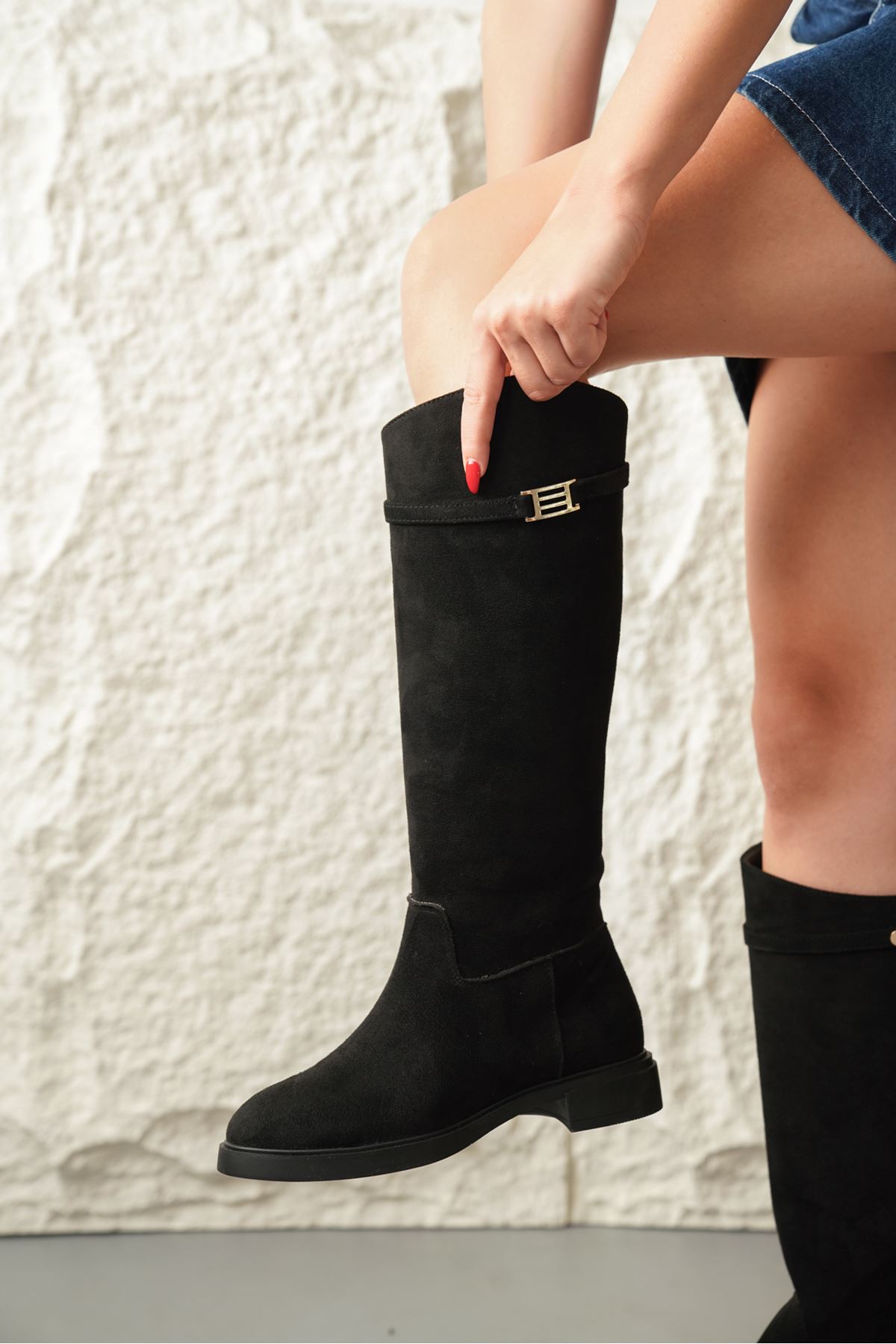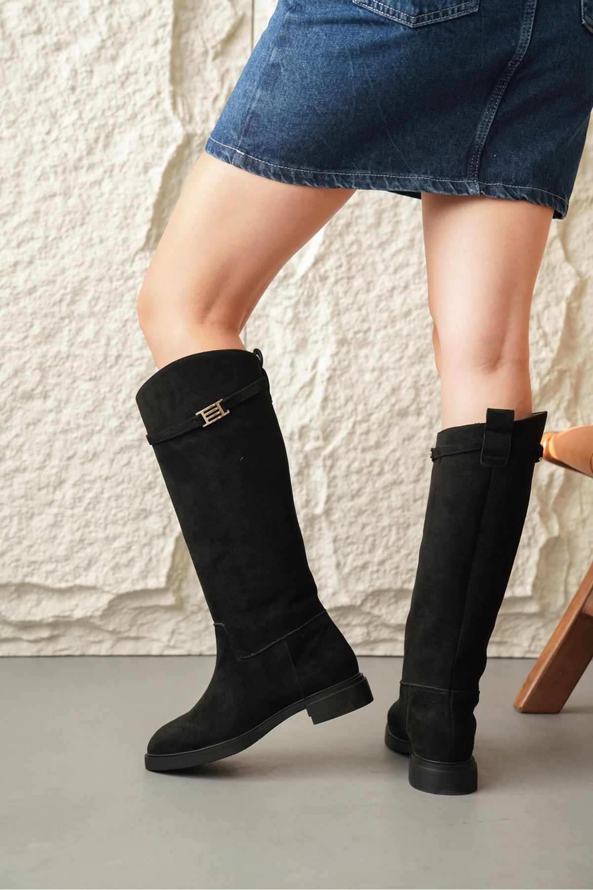 Kadın Nantes Düz Tabanlı Tokalı Çizme - Siyah Süet