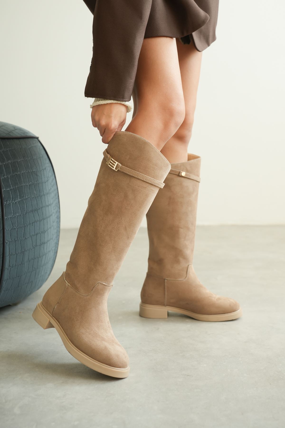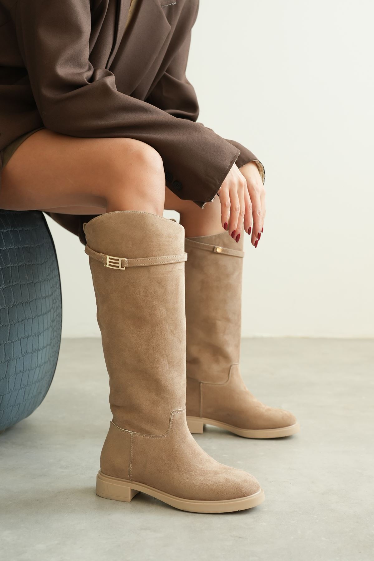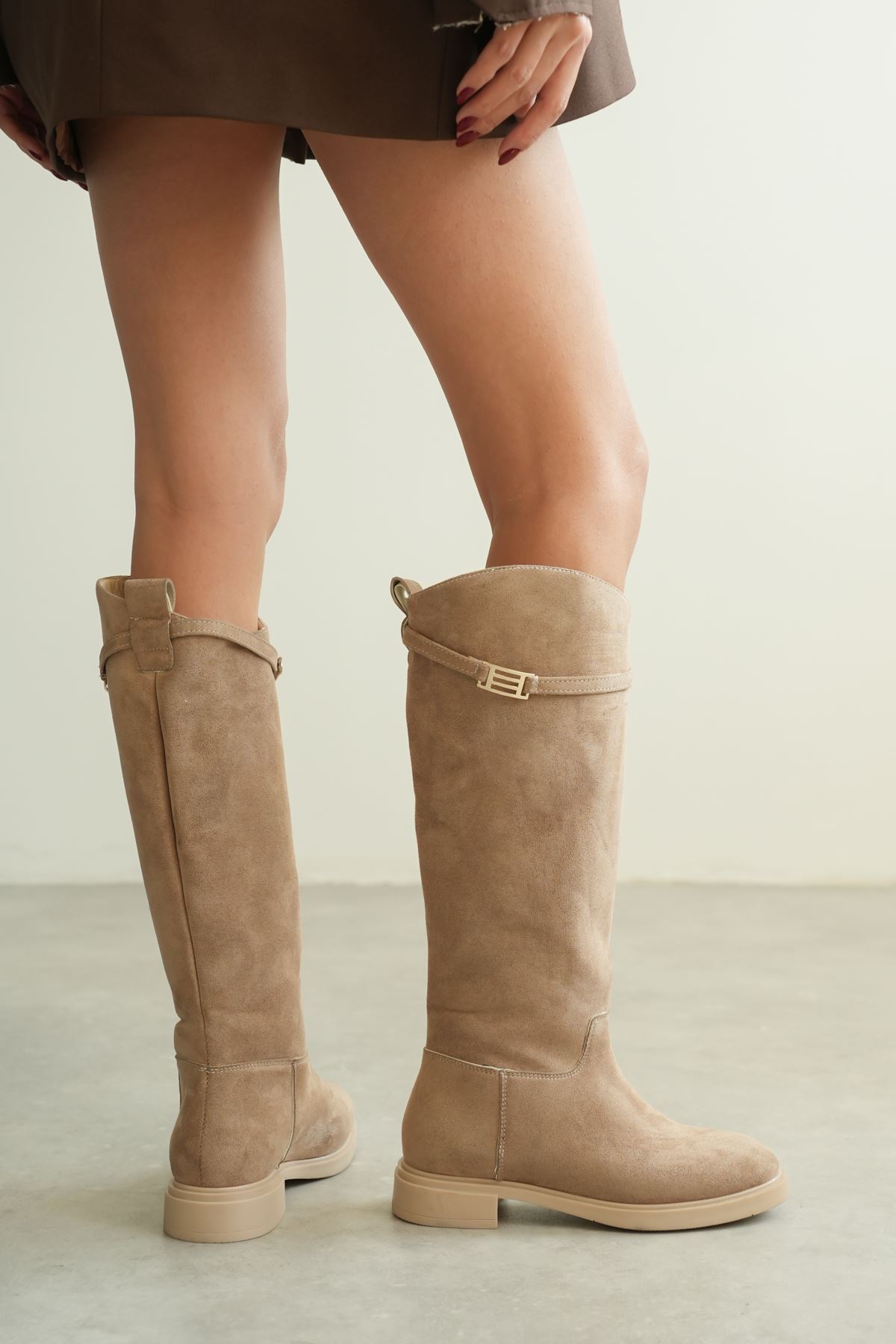 Kadın Nantes Düz Tabanlı Tokalı Çizme - Vizon