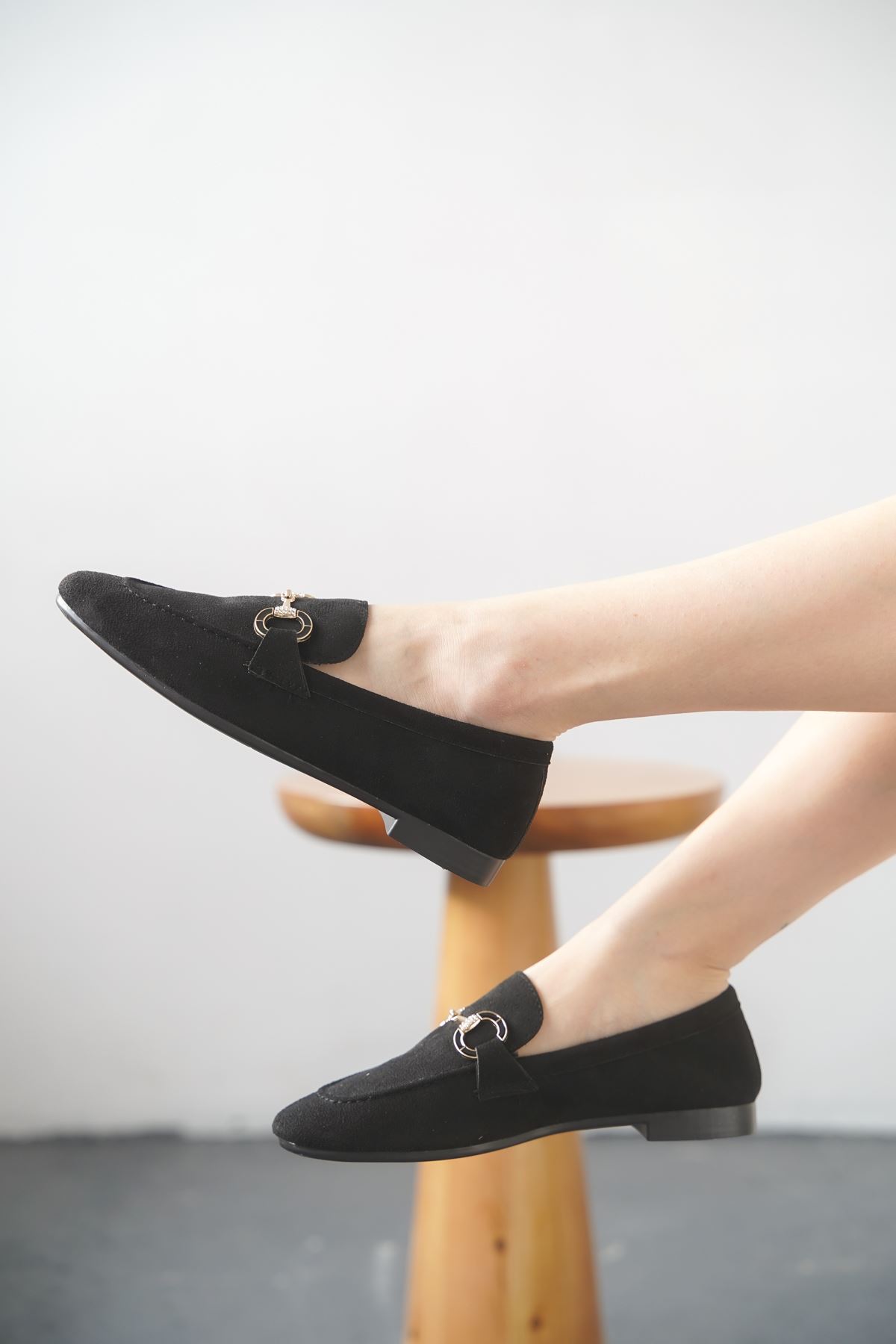 Kadın Nicol Tokalı Düz Babet - Siyah Süet