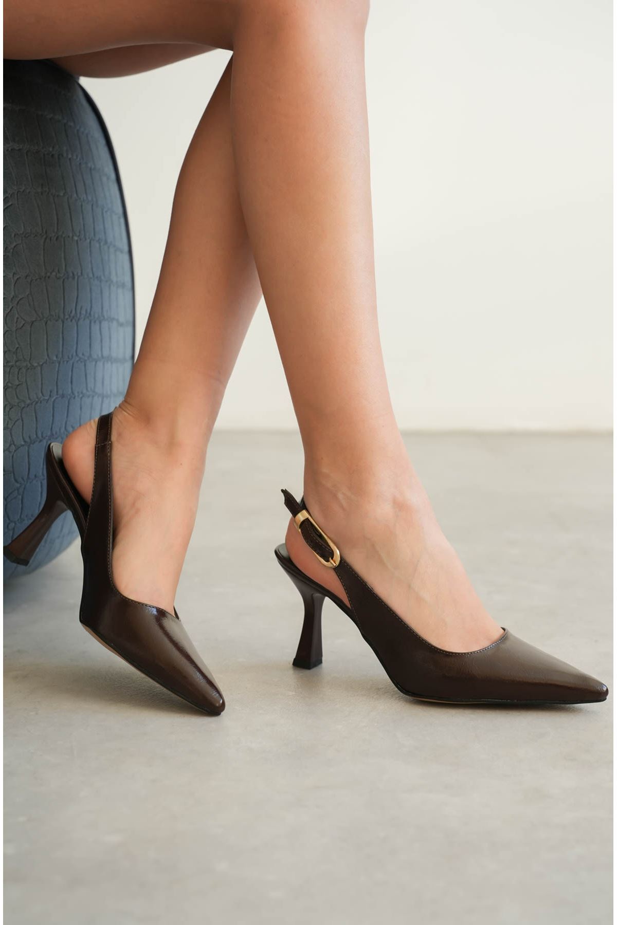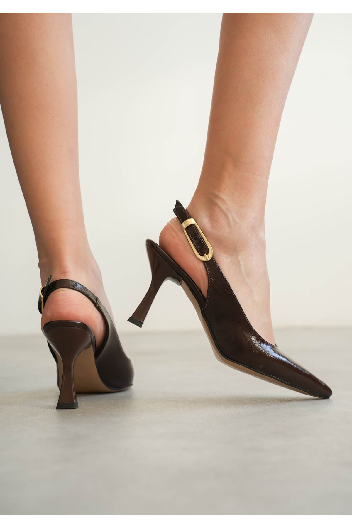 Kadın Ovis Sivri Topuklu Ayakkabı - Kahve-Kırışık Rugan