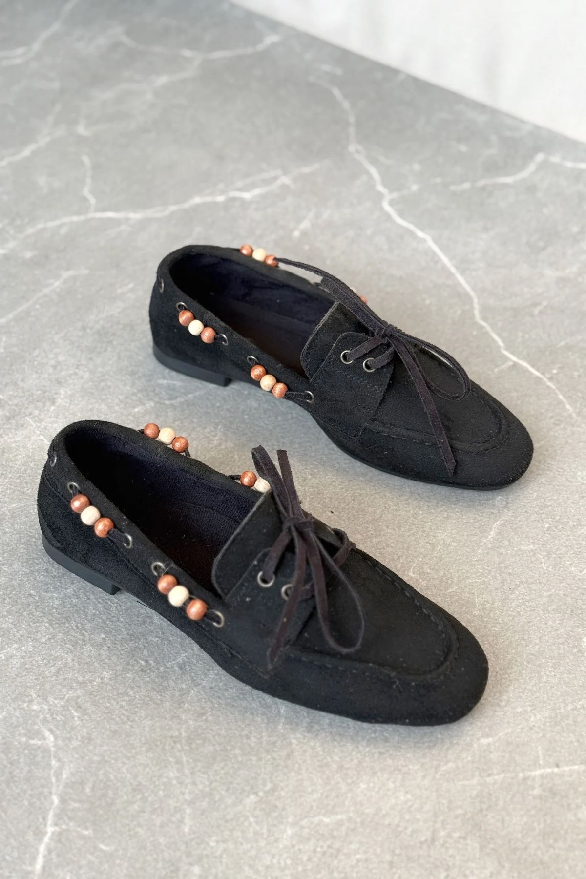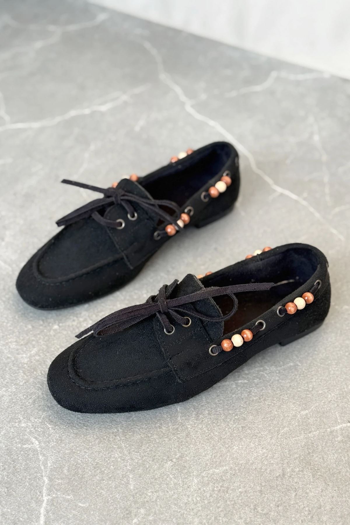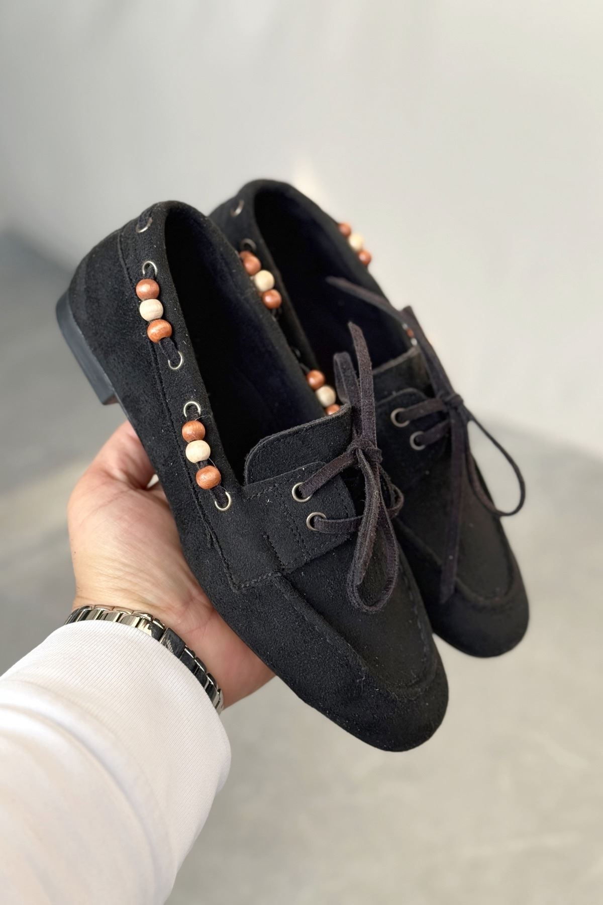 Kadın Ragus Boncuk Detay Düz Taban Babet - Siyah Süet