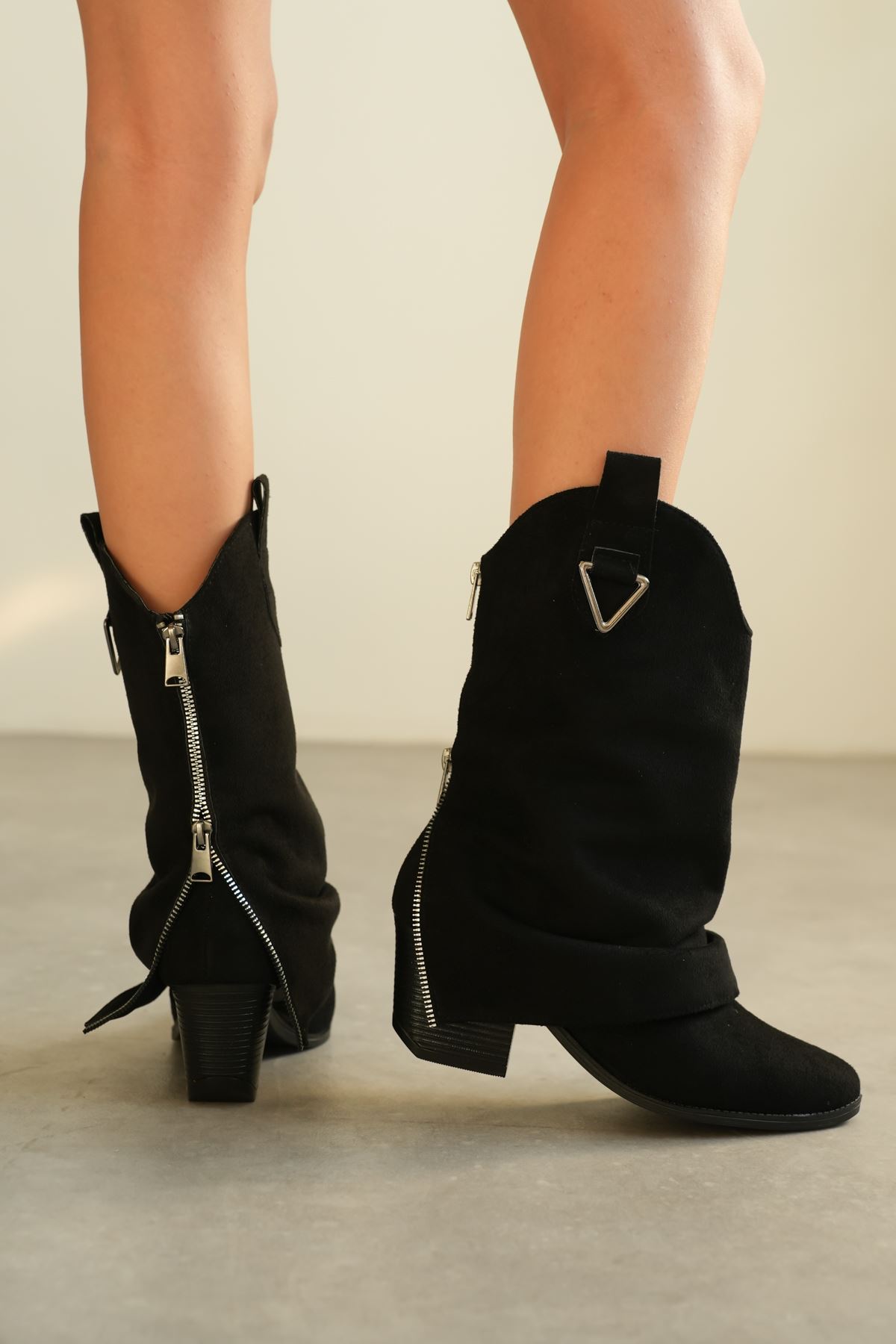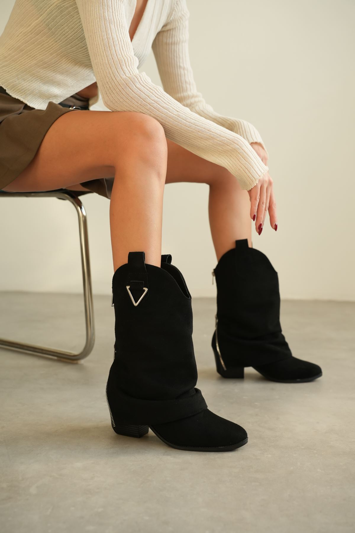 Kadın Silver Kovboy Geniş Konç Çizme - Siyah Süet